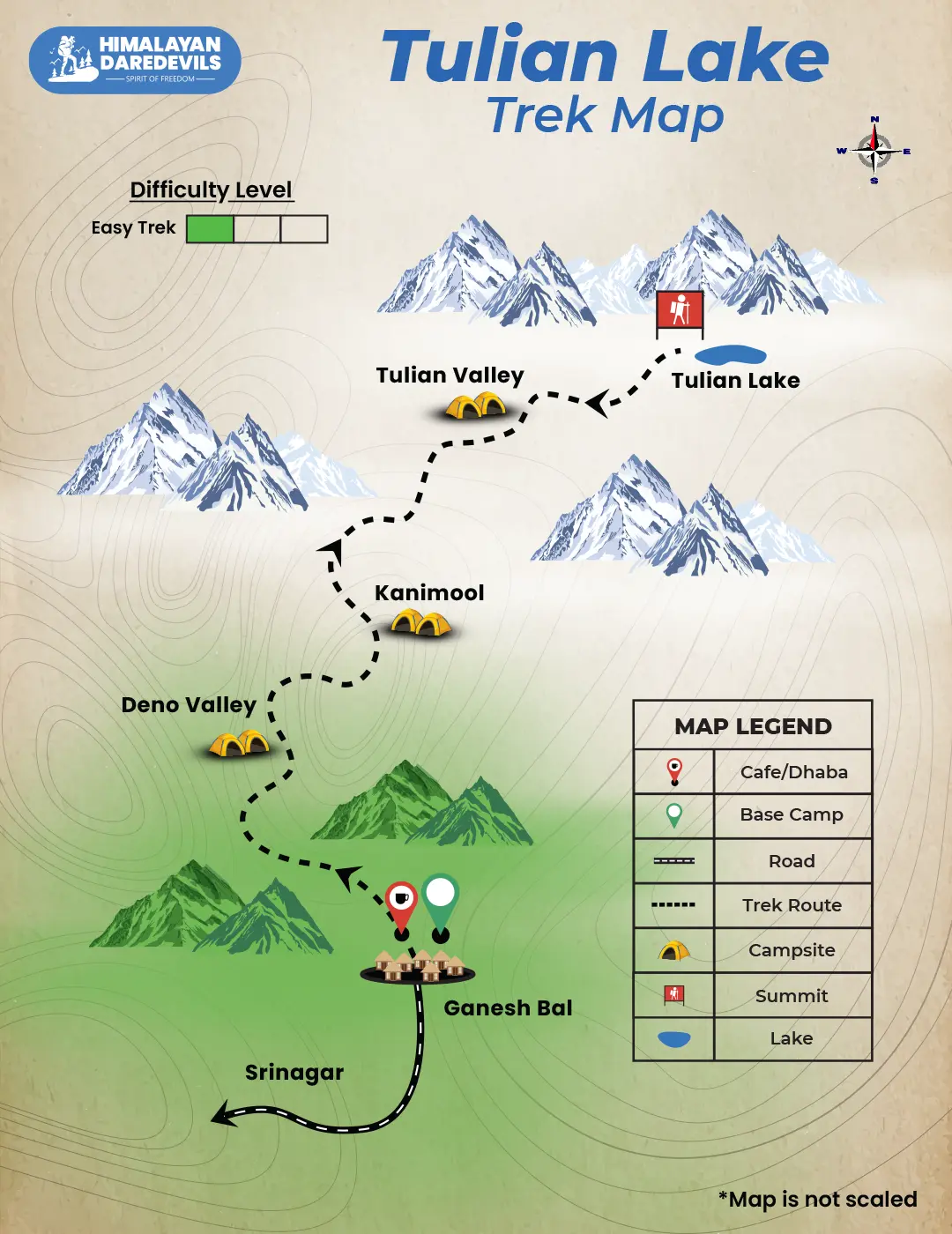 The Tulian Lake Trek is suitable for both beginners and experienced trekkers. Covering approximately 21 km over 3 days, it is shorter and less strenuous than other Kashmir treks like the Kashmir Great Lakes or Tarsar Marsar treks.